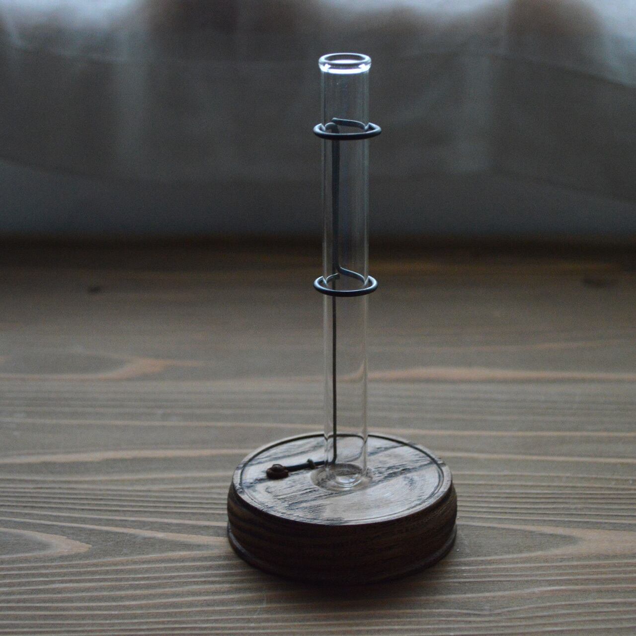 この一輪挿しは、もともと古道具屋さんで見つけた用途不明の実験器具(?)の形状にヒントを得て、試験管を支える土台として制作しました。