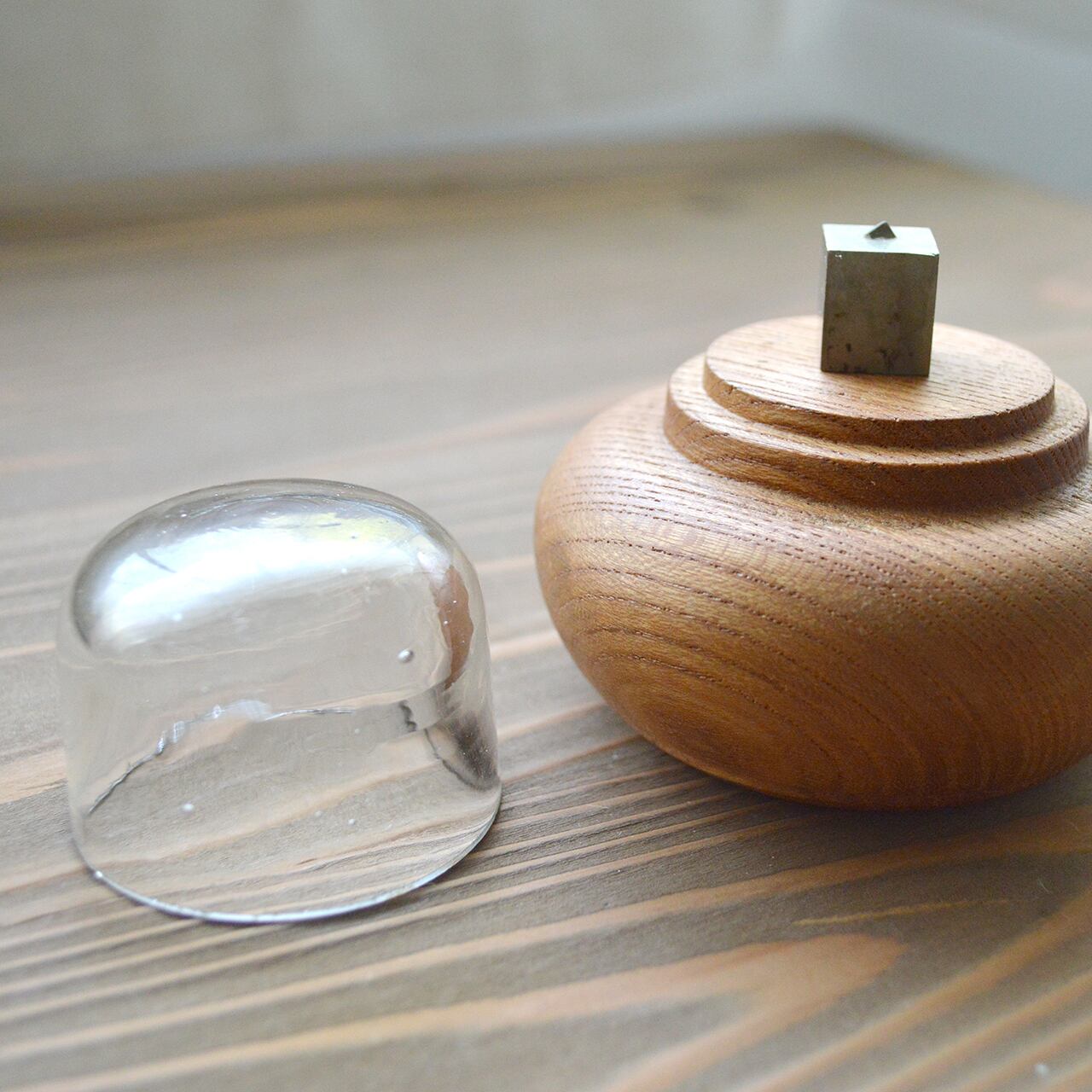 歴史を感じさせる古いガラスのゼリー型に合わせて、台座を削り小さな宝物入れのようなガラスドームに仕上げました。
