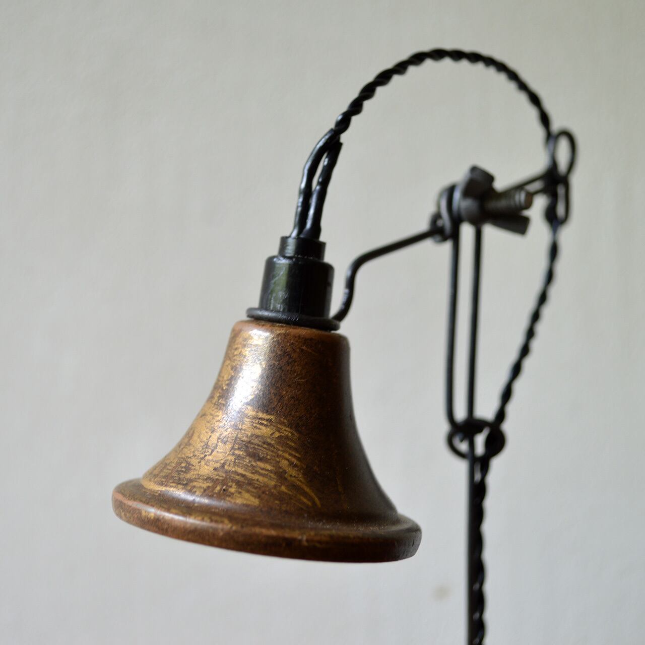 【 素 材 】台座:木材(タモ)、支柱:鉄、シェード:鉄(古い照明の部品)、電球ソケット・電池ケース:プラスチック